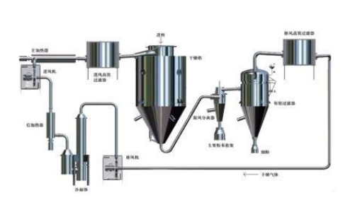 閉式循環噴霧幹燥係統是在密閉的環境下工作,幹燥介質為惰性氣體,一般為N2,適用於有機溶劑的物料幹燥有毒氣的物料或幹燥過程中易發生氧化的物料的幹燥;該係統采用惰性氣體作為循環氣體,對幹燥的物料具有保護作用,循環氣體經曆載濕、去濕的過程,介質可重複使用。在工藝過程,可根據不同物料的技術特性或工藝生產要求,由技術人員事先設計相應的工藝參數,輸入控製係統。如加熱幹燥溫度,溶劑回收冷凝溫度,輸送泵運轉速度或壓力,循環風機風量風壓,冷卻液流量等工藝數據的編程輸入,操作人員即可以編程程序實現自動操作。